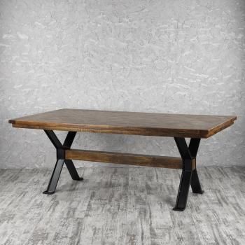 Оригинальный обеденный стол прекрасно подойдет для оформления помещения в классическом или лофт стиле. Полностью ручная работа делает этот предмет мебели действительно уникальным. Паркетный рисунок, украшающий столешницу, выполнен наборным способом. Процесс этот довольно кропотливый – по чертежам производятся заготовки и затем собираются в единое полотно. Стол выполнен из массива экзотического дерева манго, поэтому обладает повышенной прочностью и надежностью. Для придания винтажности использована технология состаривания. Металлическое подстолье изготовлено в x-образной форме, с дополнительной балкой.