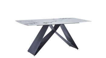 Стол обеденный с прямоугольной столешницей из керамики 12мм с принтом под белый мрамор. Каркас и ножки металлические черного цвета.