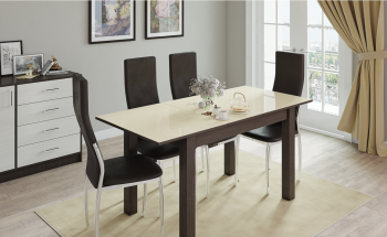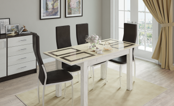 Столешница выполнена из ЛДСП и покрыта стеклом с нанесенным декором.
