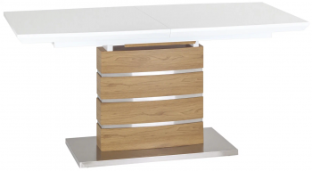 Белая столешница изготовлена из МДФ. Ножка и дополнительная вставка раздвижного механизма выполнены из МДФ в цвете светлого дерева. Благодаря вставке бабочка, стол легко раскладывается и увеличивается в длину до 200 см.