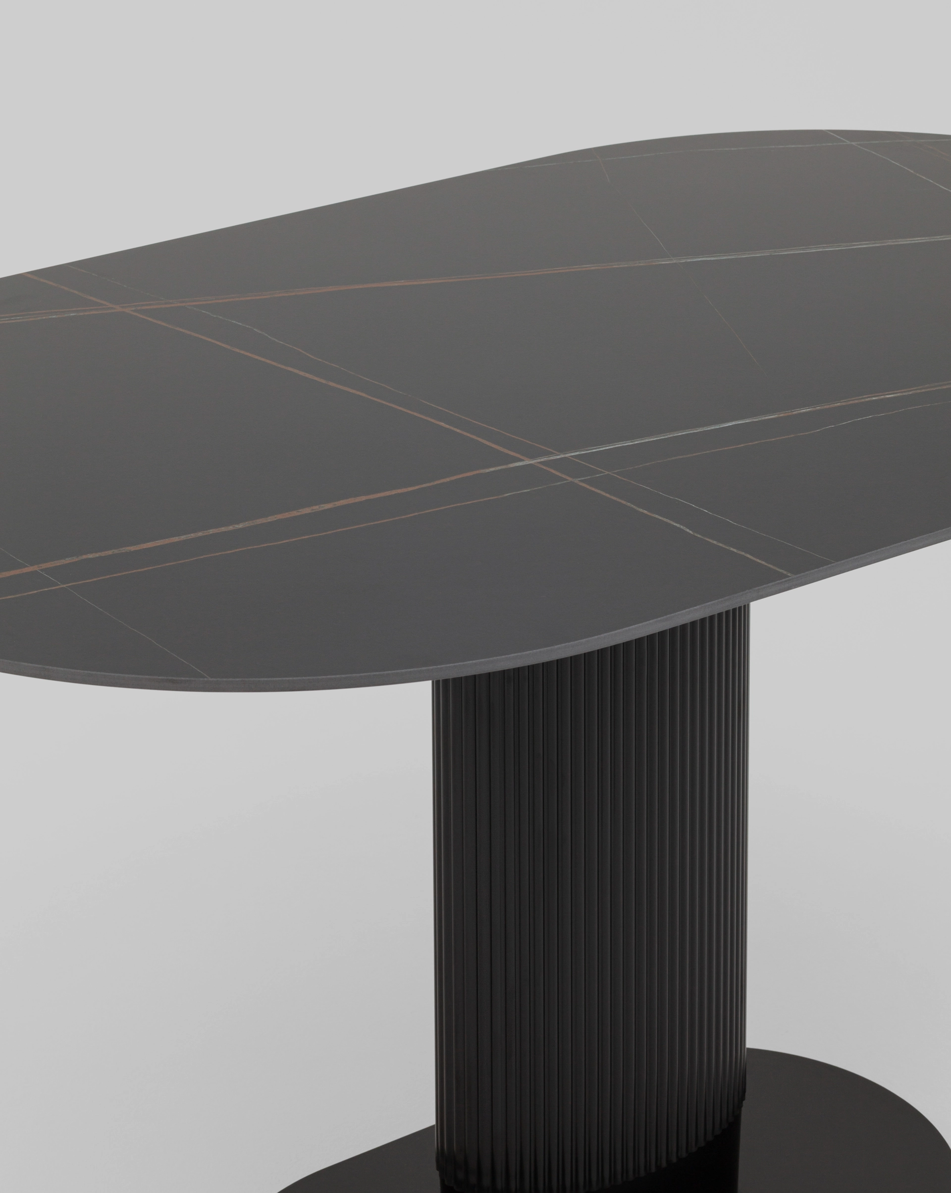 Столешница выполнена из МДФ и имеет овальную форму, что придаёт изделию элегантность и изысканность. Белый цвет столешницы добавляет свежести и лёгкости в интерьер. Ножки стола изготовлены из ABS пластика и металла, что обеспечивает прочность и устойчивость конструкции.