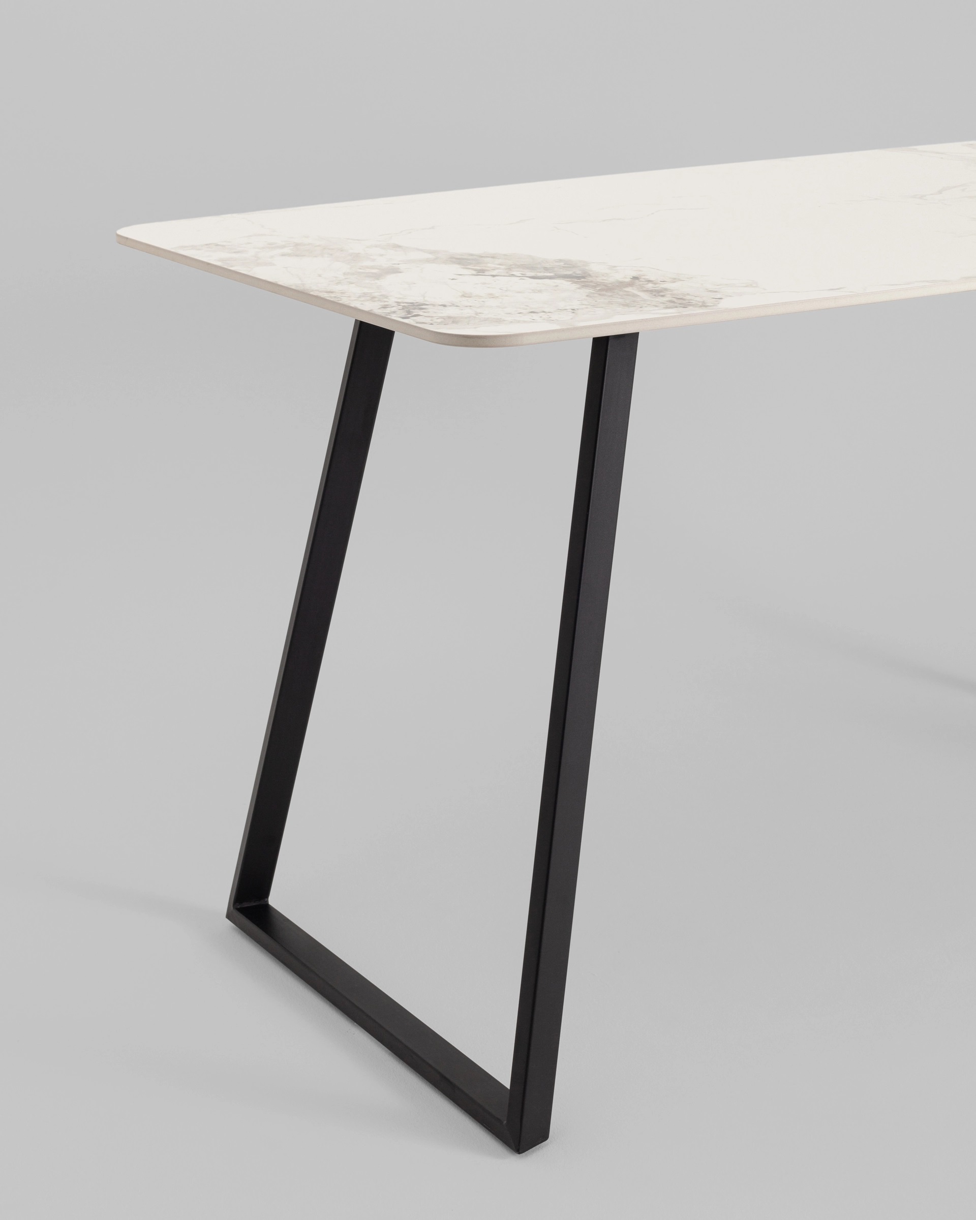 Столешница выполнена из прочной керамики, что придаёт модели премиальный внешний вид и обеспечивает устойчивость к повреждениям и пятнам. Металлические ножки добавляют устойчивости и подчеркивают минималистичный стиль стола.