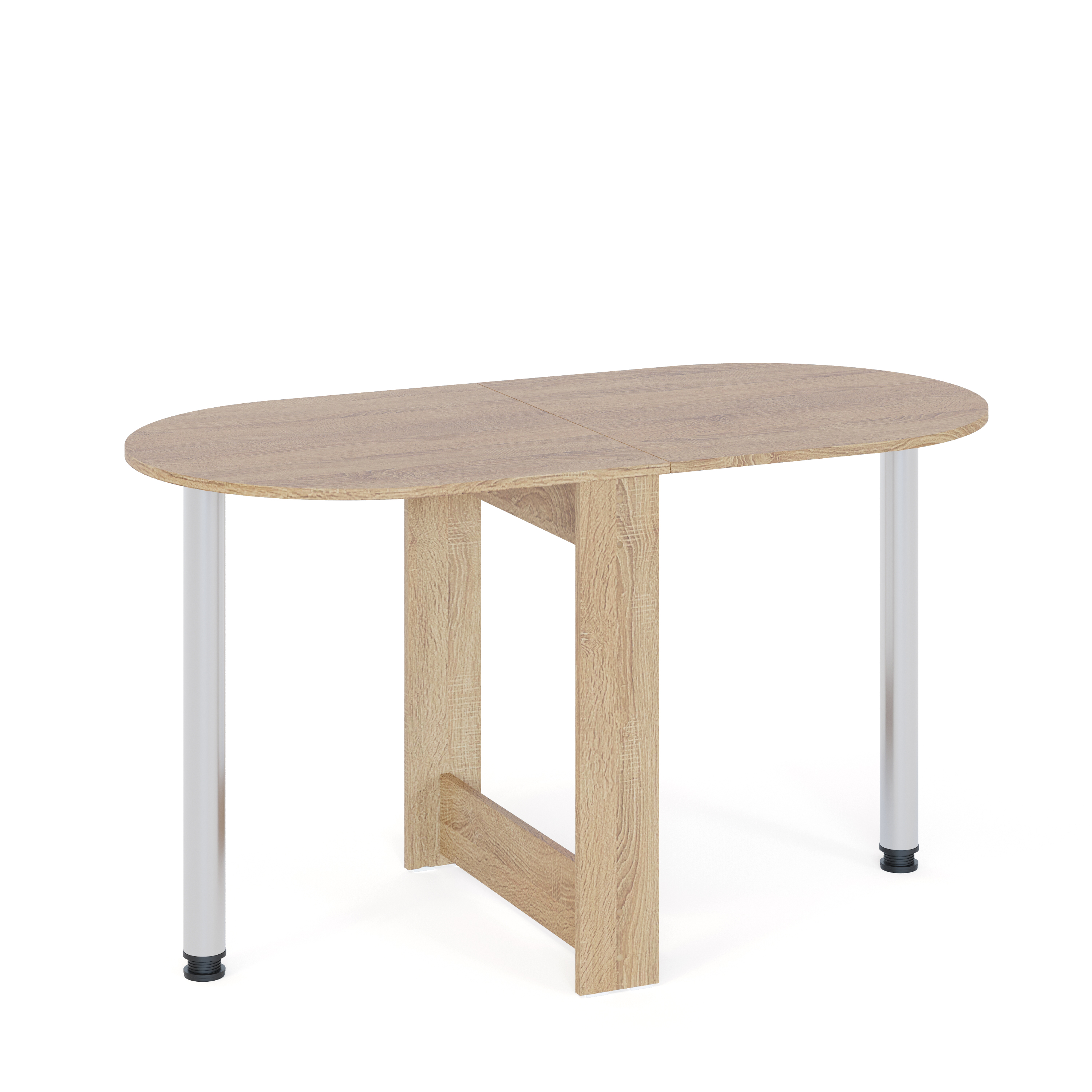 В сложенном виде стол занимает минимум места, превращаясь в аккуратную узкую поверхность. Ножка удобно хранится в специальной нише внутри основания, поэтому ее не нужно искать при раскладывании. Чтобы превратить стол в обеденный, достаточно поднять одну половину столешницы, закрепить ножку — и готово! Металлические опоры с регулировкой высоты обеспечивают устойчивость даже на неровном полу, а овальные края защитят от случайных ударов.