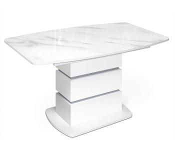 Глянцевая монолитная опора дополнена серыми вставками, которые делают дополнительный акцент ее рельефе. Благодаря стеклу глянцевая и блестящая столешница будет отражать огни помещения, создавая уютную атмосферу. Декоративная фотопечать под мрамор придаст Вашему интерьеру природный мотив и добавит естественных ноток.