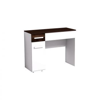 Простой с виду туалетный столик из коллекции Норвуд обладает интересной конструкцией. Откидная контрастная крышка стола скрывает нишу с органайзером для хранения мелких аксессуаров. На внутренней стороне крышки – зеркало, перед которым удобно наносить макияж и проводить косметические процедуры. Сбоку – отделение с полками за распашной дверцей и выдвижным ящиком, фасад которого выполнен из брашированного дерева цвета Орех шоколадный. Столик в закрытом состоянии можно использовать для работы на компьютере или с документами. Модуль можно собирать как на левую, так и на правую сторону.