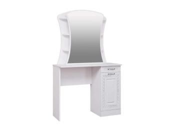 Туалетный столик Комфорт-S М6 Гертруда понравится любой женщине, если она предпочитает классический стиль в интерьере. Перламутровый оттенок столешницы и фасадов, аккуратные ручки с инкрустацией, необычная форма зеркала придают изысканности этому предмету мебели. Несколько скрытых полок за зеркалом могут используются для размещения различных мелочей, а также для организации и хранения косметики и парфюмерии.