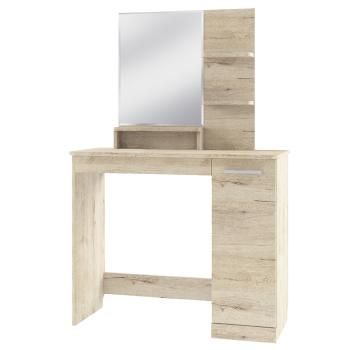 Стол туалетный Оскар – очень функциональное дополнение к интерьеру и спальни, и молодёжной комнаты, которое сделает помещение более эргономичным. Стол туалетный Оскар прямой. Конструкция элемента представляет собой панель из ЛДСП, на которую крепятся зеркало и полки, столешницу прямоугольной формы (углы на одной стороне скошены), выдвижной ящик, тумба (расположение справа) с полками из ЛДСП за глухой дверью, левую опору и две задние планки. Панель с зеркалом и полками соединяется со столешницей с помощью стяжек.