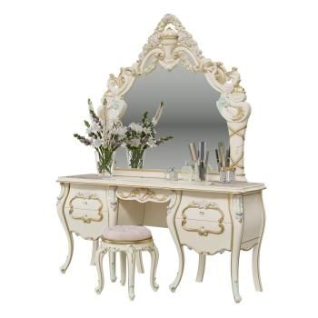 Двухтумбовый стол имеет по два вместительных выдвижных ящика в каждой и ящичек с ячейками для драгоценностей в центре.
