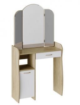 Лаконично простой и элегантный туалетный столик обладает не только эстетичным видом, но и достойной практичностью. Модель отличается эргономичной конструкцией и элегантной формой деталей. Вместительный ящик, столешница, большое зеркало и полки расположены на удобном уровне. Использование двух цветов в дизайне модели делает её оригинальной и позволяет использовать в любом интерьере.