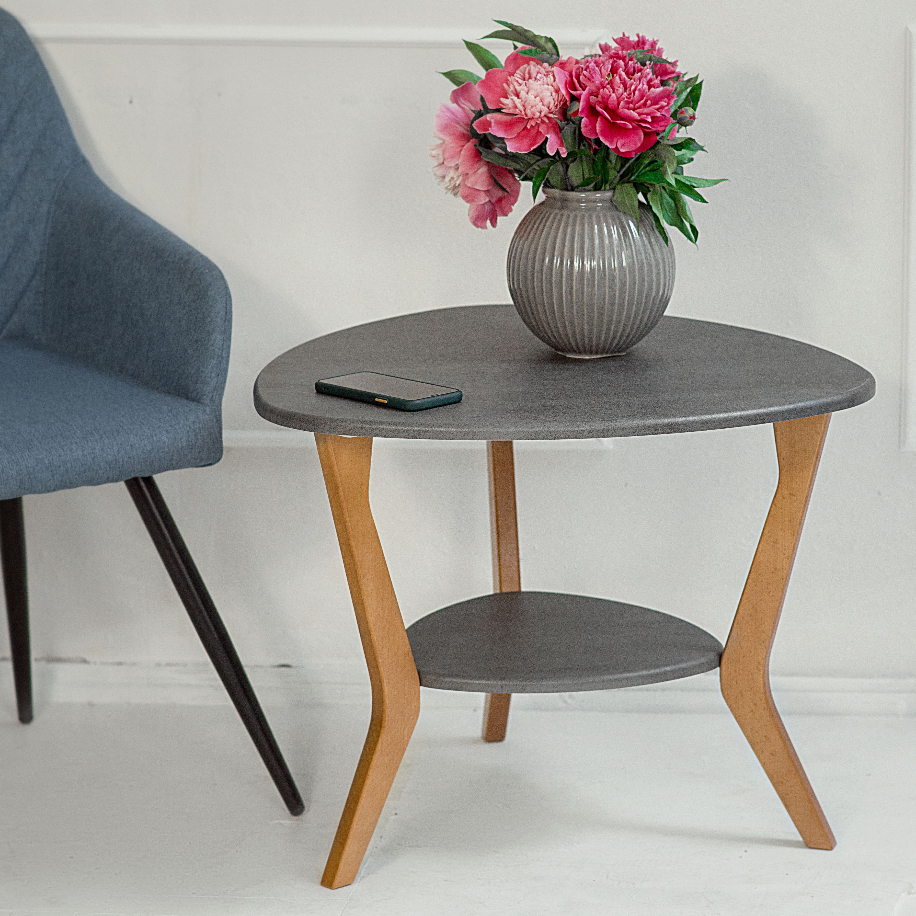 Универсальность материалов и стиля. Комбинация теплого натурального бука ножек и практичных столешницы/полки из МДФ с плёночным покрытием делает стол универсальным. Его необычная форма и натуральные материалы позволяют ему стать ярким акцентом в интерьерах лофт, добавить характер современной или скандинавской гостиной, вписаться в минимализм или техно. Возможность выбора цвета пленки (при наличии) позволяет адаптировать стол к разной палитре.