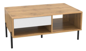 Современный журнальный столик 72.01 Кензо с выдвижным ящиком и открытыми нишами, дополнит интерьер гостиной. Корпус столика изготовлен из ЛДСП высокого качества. Фасад изготовлен из МДФ в ПВХ пленке. Фасад ящика открывается нажатием (механизм Push to open). Направляющие шариковые, полного выдвижения. Изделие установлено на высокие металлические опоры с пластиковыми подпятниками.