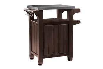 Функциональное и оригинальное решение в прекрасном стиле, такое как стол для гриля, украсит любой сад или террасу. Основным преимуществом продукта является его мультифункциональность. Необычная конструкция позволяет использовать его, как стол для приготовления блюд, и как шкафчик для хранения различных продуктов и ингредиентов. Столик оснащен столешницей из нержавеющей стали, удобной ручкой с дополнительными вешалками и колесиками, благодаря которым продукт удобно перемещать в разные места. Во вместительный шкафчик можно положить подручные аксессуары, необходимые для приготовления и подачи блюд на свежем воздухе.