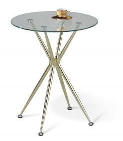 металлический каркас окрашен золотой краской, устойчивой к механическому воздействию. Столешница выполнена из толстого закаленного стекла с безопасной обработанной кромкой (толщина стекла 5 мм, расстояние от края до крепления 70 мм).