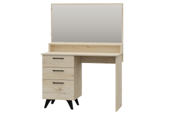 Туалетный столик с зеркалом из модульной коллекции Sofia прекрасно впишется в современный интерьер Вашей спальни и позволит держать свой внешний вид под контролем. Модель оснащена тремя выкатными ящиками на шариковых направляющих полного, плавного и бесшумного выдвижения, просторной столешницей, открытой широкой полкой и зеркалом. Черные опоры гармонично дополняют модуль и визуально приподнимают его над полом, что облегчает процесс уборки.