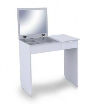 Компактный, элегантный туалетный столик Римини-1 выполнен из ламинированного ДСП, который прочный и влагостоек, благодаря чему не требует специального ухода. Стол оснащен встроенным зеркалом, которое находится на внутренней части поднимающейся части столешницы. Под столешницей есть достаточно места для хранения с отсеками, в котором удобно хранить флаконы с духами, косметику или средства гигиены. Справа от открывающейся части расположился выдвижной ящик для украшений. Ящик имеет шариковый тип направляющих.