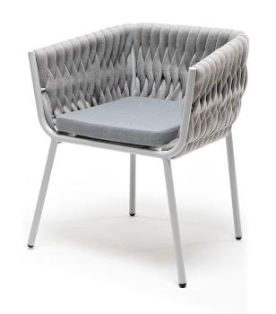 Стул «Монако» изготовлен из алюминиевого каркаса окрашенный порошковой краской в светло-серый (RAL7035) цвет. Боковины каркаса вручную оплетены роупом – эластичными синтетическими лентами, изготовленными из высокопрочных полиэфирных волокон. Цвет оплетки – светло-серый.