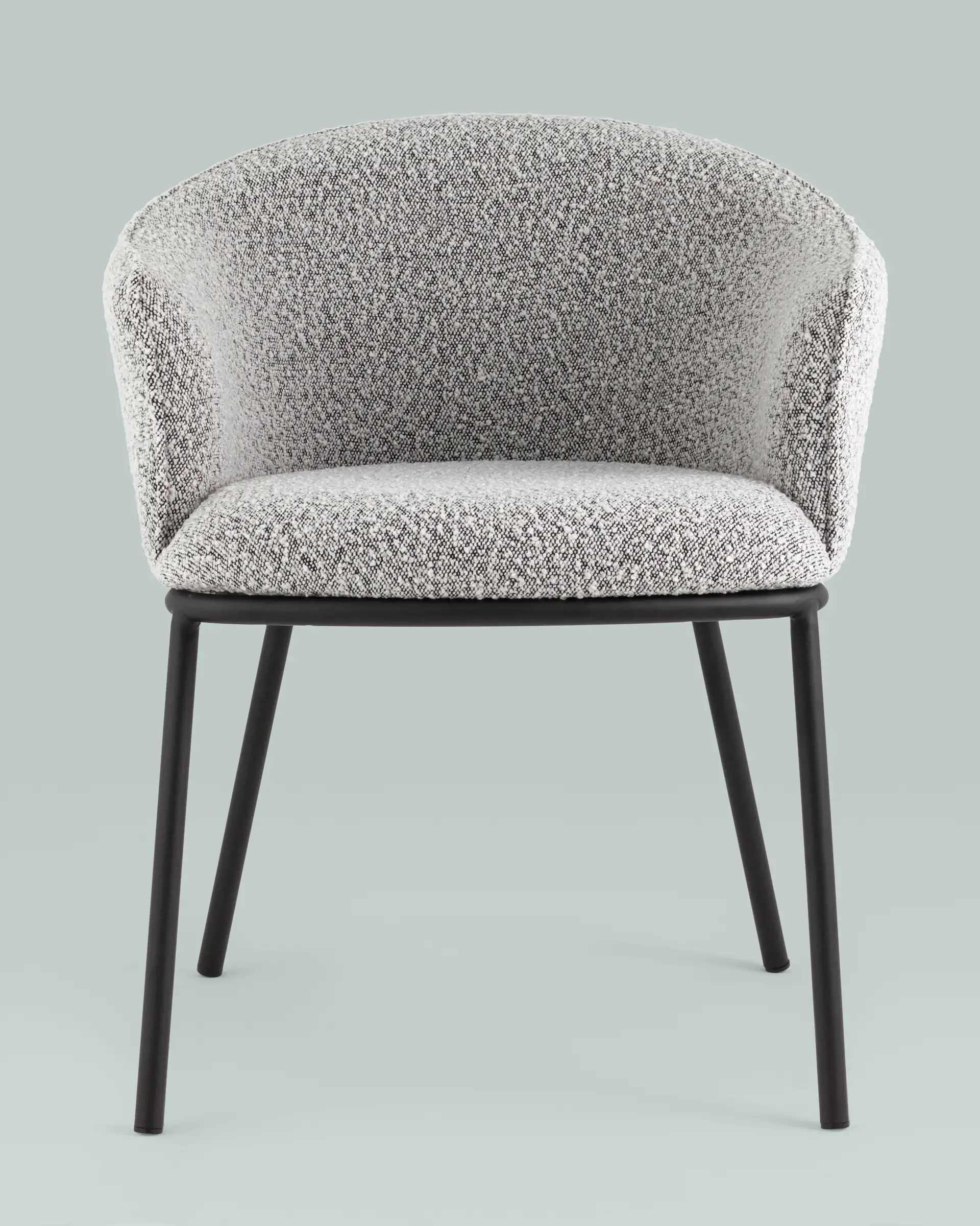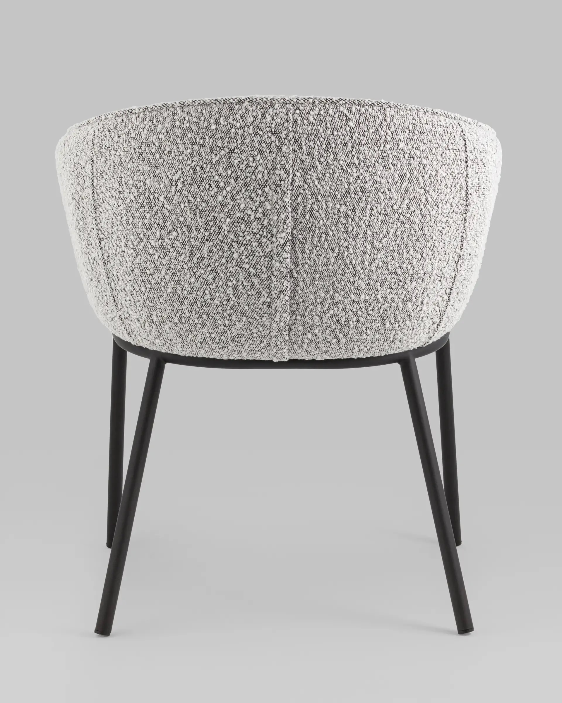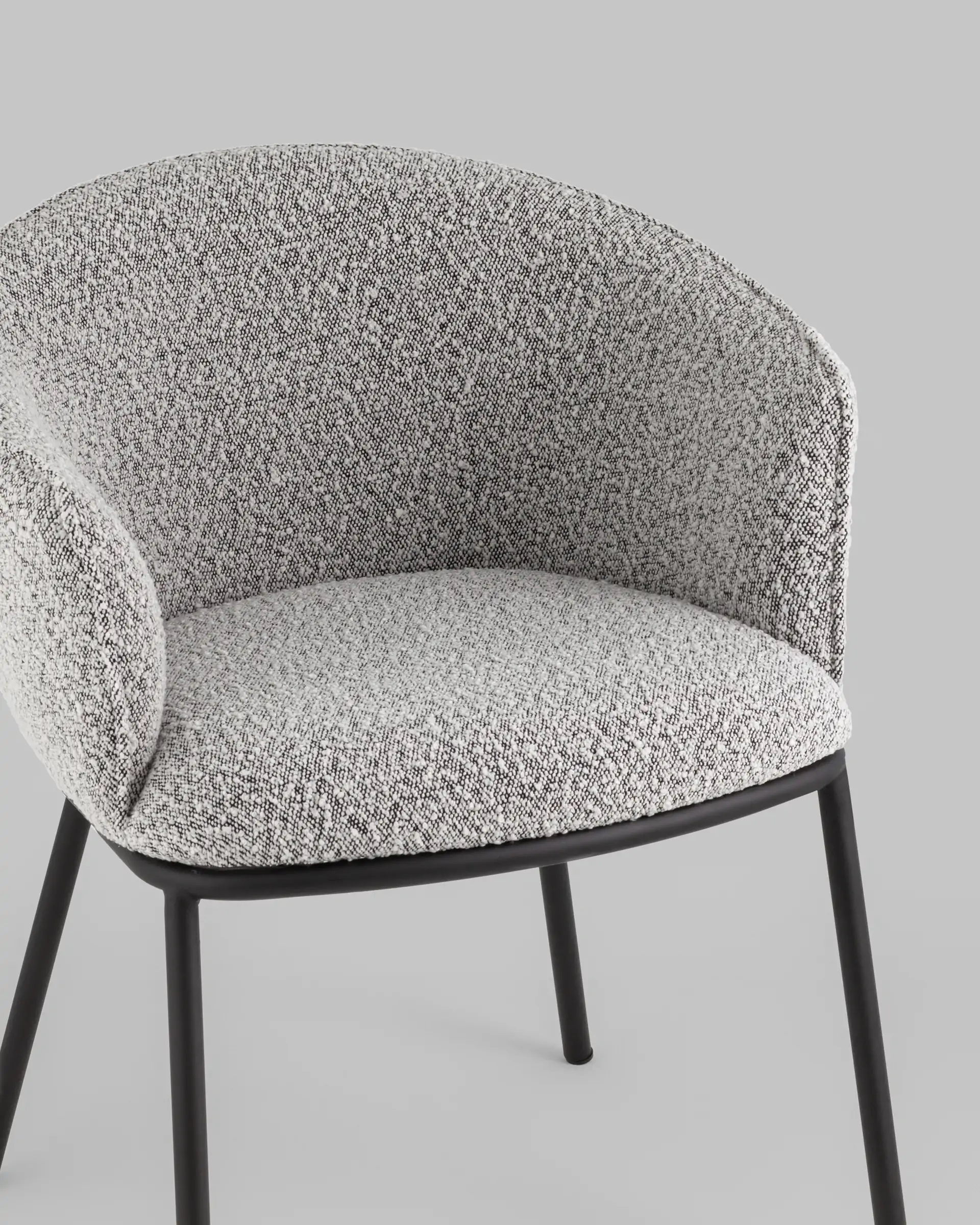 Обеденный стул Дон с мягкой полукруглой спинкой и сидением из ткани букле отлично впишется в обеденную зону любой современной кухни. Каркас металлический, ножки выполнены в черном цвете. Дополнительно предусмотрены специальные подпятники, которые предотвращают скольжение и повреждение напольного покрытия. Прекрасно сочетается с обеденным или письменным столом.