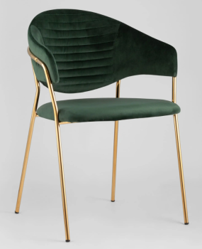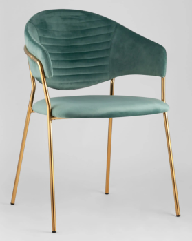 Стильный кухонный стул с оригинальной формой спинки, высокой поддержкой и подлокотниками. В качестве обивки используется мягкий велюр. Металлический каркас золотого цвета огибает спинку и выступает аккуратным акцентом модели. Широкое сиденье обеспечивает удобную посадку и уют.