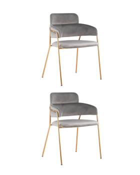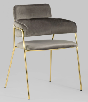 Стильный стул с оригинальной формой спинки, высокой поддержкой и подлокотниками. В качестве обивки используется мягкий велюр. Металлический каркас золотого цвета огибает спинку и выступает аккуратным акцентом модели. Широкое сиденье обеспечивает удобную посадку и уют.