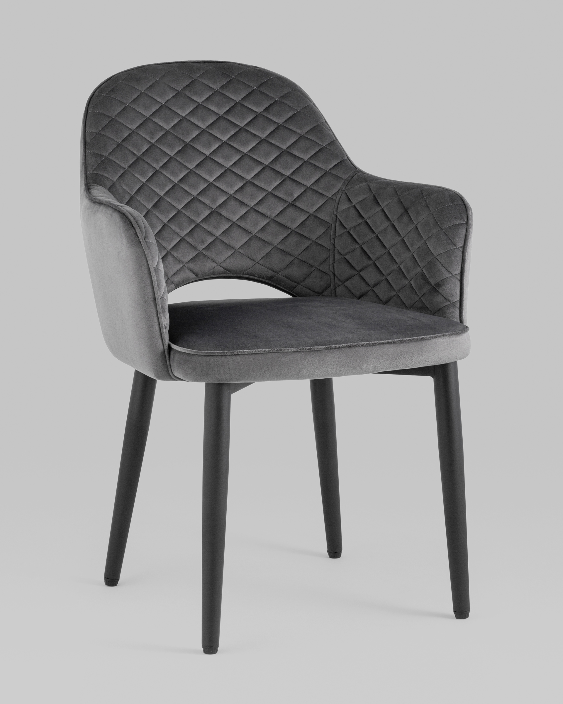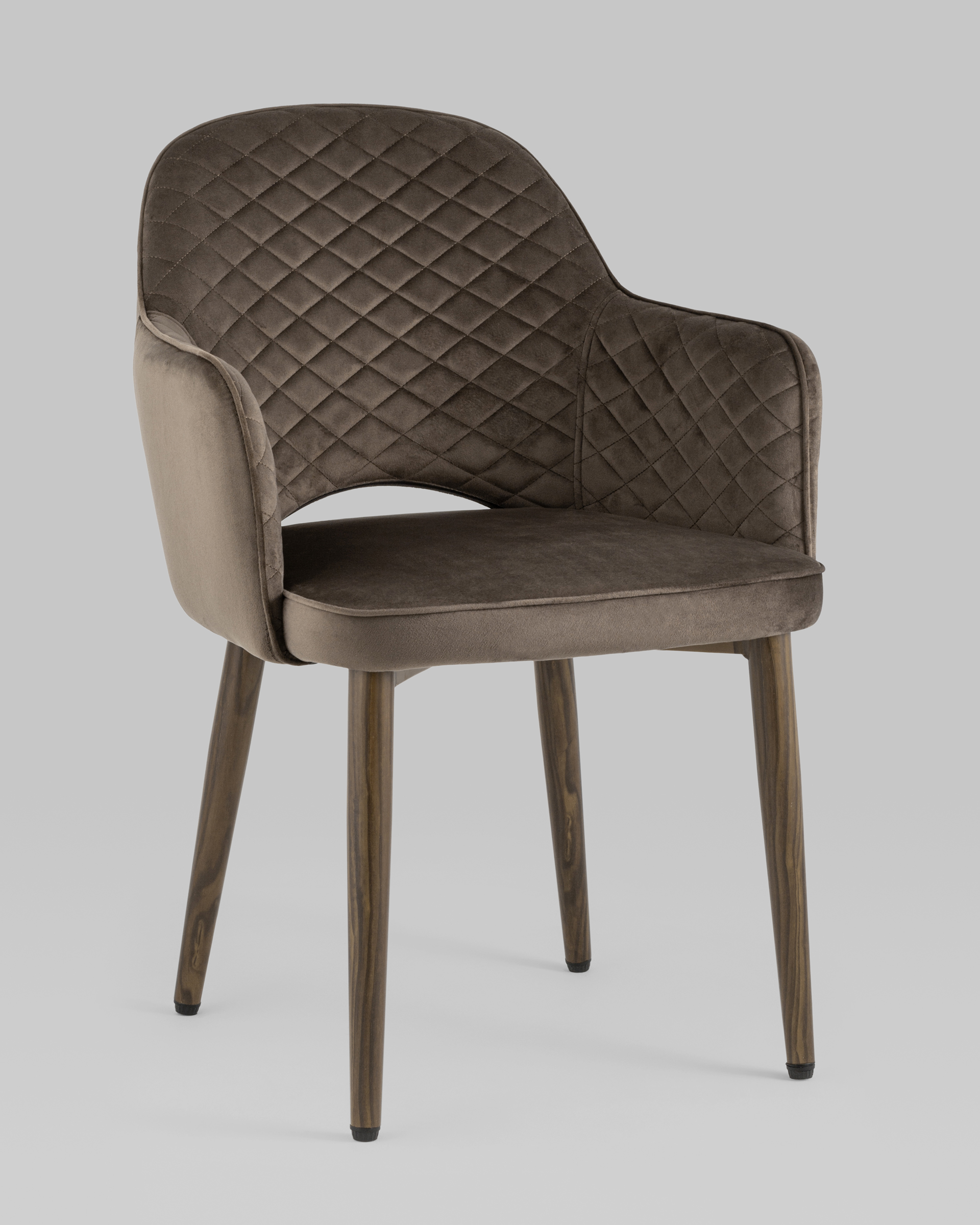 Мягкий стул с округлой спинкой анатомической формы и удобными подлокотниками подарит комфорт и уют. В качестве обивки используется велюр – прочный износостойкий материал. Внутренняя сторона спинки и подлокотников украшена декором в виде ромбов. Высота подлокотников от пола – 64,5 см.