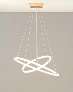 Современная светодиодная подвесная люстра из серии Lama. В качестве источника света служат светодиодные ленты общей мощностью 73 Вт и световым потоком 4080 Лм. Светодиодные ленты в пластиковой оболочке выполнены в виде двух колец с разным диаметром. Крепление состоит из нескольких тросов, которые при необходимости можно отрегулировать по высоте для создания комфортного освещения. Вся конструкция крепится к потолку с помощью простой и надежной крепежной планки. Подвесная люстра Lama с площадью освещения 14 м² оригинальное решение для кухни, гостиной или обеденной зоны.