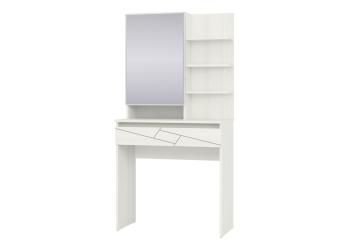 Туалетлый столик с сдвижным зеркалом,закрытыми и открытыми полочками и большим выдвижным ящиком.