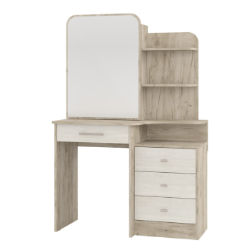 Туалетлый столик с зеркалом, открытыми полочками и 4-мя выдвижными ящиками. Зеркало сдвижное за которым расмещены дополнительные полочки для хранения