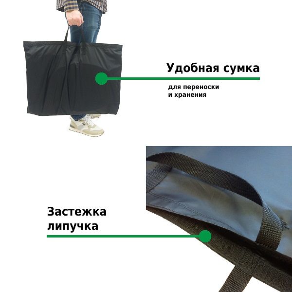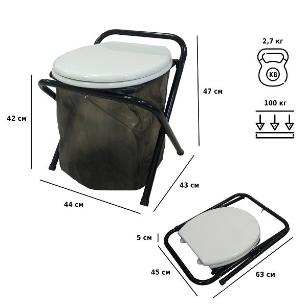 Собирается походный туалет быстро, без использования инструментов. Фиксация конструкции происходит с помощью винта с гайкой – барашек. В сложенном состоянии туалет помещается в удобную сумку чехол, что облегчает его транспортировку и хранение.