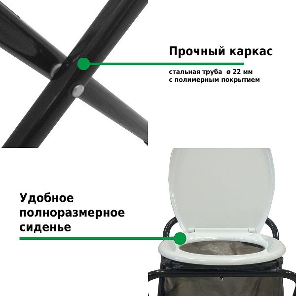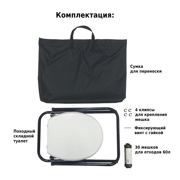 Комплектация: каркас-основание, сиденье с крышкой, фиксирующий винт с гайкой, клипсы для крепления мешка – 4 шт, мешок для отходов 60л – 30шт, сумка для переноски.