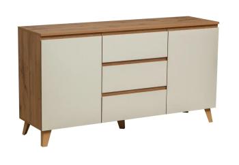 Стильный тумба-комод из серии Авалон с 3-мя выдвижными ящиками и 2-мя распашными дверцами. Изделие установлено на высокие ножки. Изготовлен из ЛДСП высокого качества.