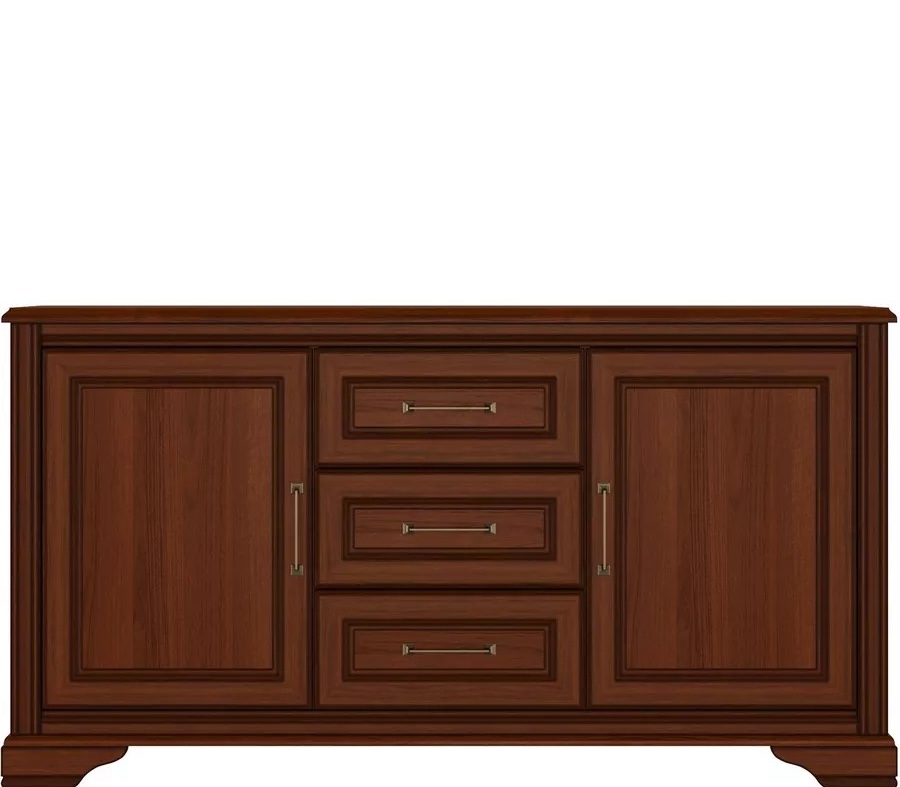 Сверху полутораметровой крышки, сделанной, как и весь корпус, из ламинированной ДСП, встанет немало полезных и красивых вещей: от телевизора и аквариума до фотографий и декоративных украшений. Боковые тумбочки одинаковые, с одной полкой.