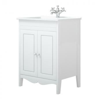 У тумбы 2 распашные двери с фрезеровкой. Петли на дверях с доводчиками. Позади дверей полка. Белая глянцевая эмаль.