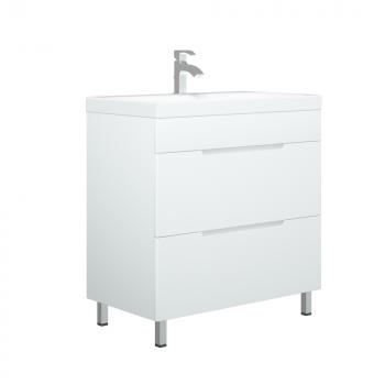 Тумба оснащена 2 выдвижными ящиками на направляющих скрытого монтажа с доводчиками. Верхний ящик высотой 140 мм с выпилом под коммуникации, нижний – 140 мм. Фасады не имеют ручек, конструктив тумбы позволяет открывать фасады непосредственно руками. У тумбы 4 металлические опоры. Фасады МДФ и боковины покрашенны в глянцевую белую эмаль.