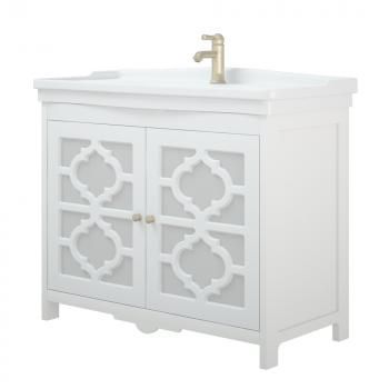 Комплексное решение для роскошных ванных комнат. У тумбы 2 распашные двери с фрезеровкой, позади фрезеровки – стекло. За дверьми полка. Вся тумба покрашена в матовую белую эмаль.