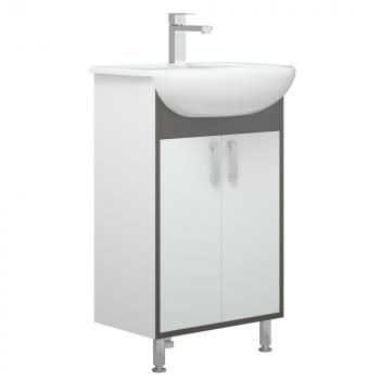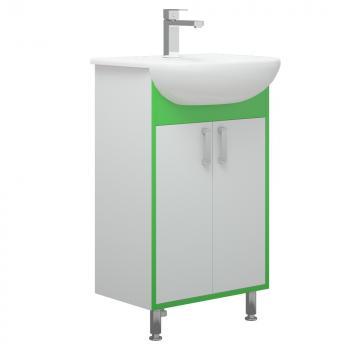 Тумба оснащена двумя распашными дверцами и одной полочкой за ними. У тумбы 2 мет. опоры спереди, сзади 1 пластиковая. У тумбы цветным является коромысло и кромка с видимой части. В ручку вставлена такая же по цвету кромка, что придает изделию особый шарм. Дверь – крашенная эмалью. Коромысло – МДФ в плёнке.