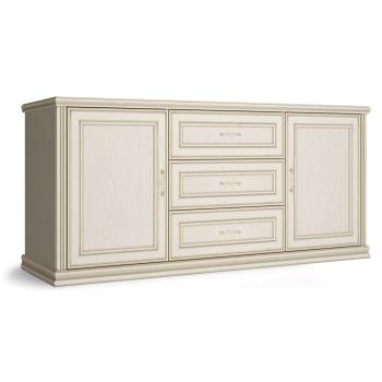 Ширина этого модуля позволит разместить телевизор с большой диагональю. Его конструкция очень вместительна и включает выдвижные ящики в центральной части и отделы с полками и дверцами по бокам