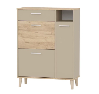 Вместительная тумба для обуви с 2-мя откидными секциями, выдвижным ящиком и шкафчиком за распашной дверцей дополнит интерьер прихожей.