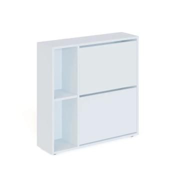 Тумба для обуви с двумя закрытыми отделениями и двумя открытыми нишами станет стильным дополнением квартиры или дома. Основное преимущество данной модели – это ее вместительность при небольших габаритах. Тумба вмещает не менее 8 пар обуви на полках. Сверху можно разместить ключи, бижутерию, сумки. А в боковых нишах предусмотрено место для хранения более крупных аксессуаров – зонты, шапки и прочее. Благодаря своему лаконичному дизайну тумба для обуви впишется в любой интерьер дома или квартиры. Удобные вырезы вместо ручек на фасадах создают безопасное пространство.