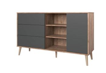 Современная тумба – комод 6-56003 с 1-ой распашной дверцей, открытыми полками и 3-мя выдвижными ящиками. За дверцей скрыты полки , ящики глубокие на направляющих полного выдвижения. Механизм открывания и закрывания Push-to-Open – нажатием. Изделие установлено на высокие опоры.