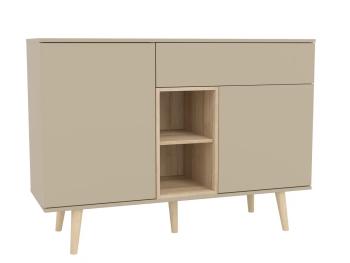 Современная тумба – комод 6-56024 с открытыми полками, 2-мя распашными дверцами и широким выдвижным ящиком. Ящик на направляющих полного выдвижения. Механизм открывания и закрывания Push-to-Open – нажатием. Изделие установлено на высокие опоры.