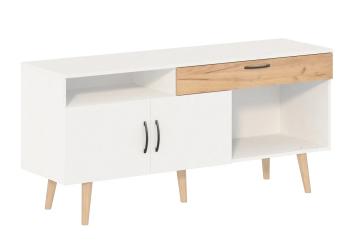 Современная тумба – комод 6-56028 с 2-мя распашными дверцами, открытыми полками и широким выдвижным ящиком. За дверцей скрыта полка , ящик на направляющих полного выдвижения. Механизм открывания и закрывания Push-to-Open – нажатием. Изделие установлено на высокие опоры.