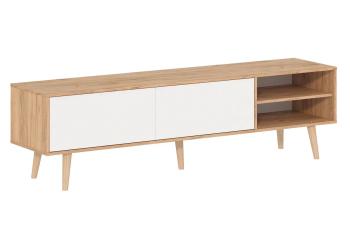 Современная тумба – комод 6-56029 с открытыми полками и 2-мя выдвижными ящиками. Ящики на направляющих полного выдвижения. Механизм открывания и закрывания Push-to-Open – нажатием. Изделие установлено на высокие опоры.