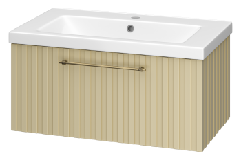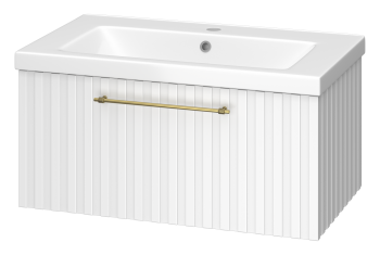 Комплект мебели BREVITA Аликанте включает подвесную тумбу с одним вместительным выдвижным ящиком и раковину Днепрокерамика Этна 80, выполненную в классической прямоугольной форме. Удобство монтажа (тумба подвешивается на стену), эргономика конструкции и лаконичный дизайн позволяют максимально эффективно использовать пространство в ванной комнате. Раковина шириной 800 мм, с отверстием под смеситель по центру и переливом, прекрасно дополняет стильный фасад тумбы.