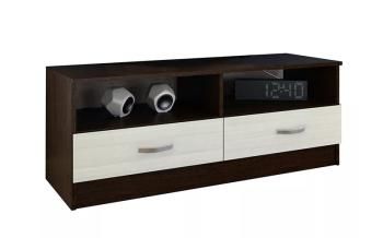 Практичным вариантов для организации ТВ-зоны станет тумба TV1. Модуль шириной 120 см имеет два выдвижных ящика и две открытые ниши, в которые поместятся книги, журналы, пульт и другие вещи. Контрастный декор с текстурой натурального дерева и металлические ручки являются украшением тумбы.