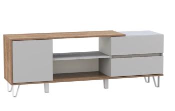 Широкая тумба под ТВ 58.08 из модульной системы «Гавана» с 3-мя выдвижными ящиками на шариковых направляющих. Высокие опоры визуально неотличимы от металлических, но выполнены из пластика и не царапают напольное покрытие.