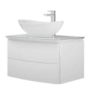 Тумба оснащена 2 выдвижными ящиками на направляющих push to open. Для открывания нужно нажать на фасад ящика. Сверху на крышке расположена стеклянная крашенная столешница, в которой находятся вырезы для установки раковин в столешнице. Верхний ящик высотой 80 мм с выпилом под коммуникации, нижний высотой 95 мм. Коромысло, фасады, крышка – МДФ в плёнке, корпус – ЛДСП. Имеются подвесы для крепления к стене. Столешница тумбы изготовлена из высококачественного и очень прочного стекла Лакобель. Раковина может быть выбрана на любой вкус. Классический вариант для комплектования тумбы Огайо – раковина Гамма 56.