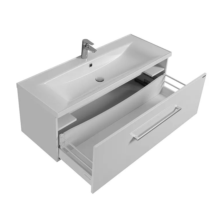 Тумба Мадрид 120 М от AQUATON в белом цвете – воплощение эстетики минимализма в чистом виде. Модель привлекает внимание простотой форм и четкостью линий. Корпус из влагостойкой ЛДСП и фасад из высококачественной МДФ покрыты полиэфирной краской ультрафиолетового отверждения с высокой степенью глянца. Тумба оснащена вместительным ящиком со встроенной системой плавного закрывания и комплектуется удобной раковиной из литого мрамора. На дне ящика расположен антискользящий коврик.