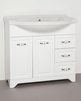 Тумба напольная бренда “Style Line” коллекции “Олеандр-2” классического дизайна, декорированная ручками с керамическими вставками “под бронзу” с изящным рисунком. Направляющие полного выдвижения Hettich; сборка изделия с помощью эксцентриковых стяжек Hafele; все материалы полностью влагостойкие. Данная тумба предусматривает открытую подводку воды