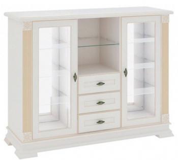 Тумба витрина Афина МН-222-01 – многофункциональная мебель для гостиной или в спальню. Такая тумба-витрина, может служить и тумбой под ТВ. Все благодаря достаточно большой ширине верхней полки. Сочетание стекла и светлого глянцевого фасада выглядит очень дорого и аристократично. Изюминки добавляет интересный орнамент. Дизайн заслуживает высшей похвалы. В наличии много выдвижных ящиков, полок открытого и закрытого типа. Среди особенностей модели: европейские материалы, патинирование, металлические ручки от Gamet (Польша), бесшумный направляющие с доводчиком Quadro от Hettich (Германия), петли – Intermat от Hettich.