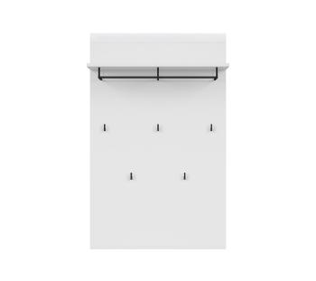 Белые материалы и черный металл — основные стилеобразующие элементы модели. В качестве основы использована плита ЛДСП, украшенная сверху планкой из МДФ цвета белый глянец, 143 на 90 сантиметров — размеры подойдут и для длинной верхней одежды.